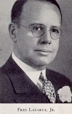 Fred Lazarus Jr. briefly attended Ohio State University, but dropped out at the age of 18 to work full-time in the family's store.[2] The F. & R. Lazarus & Co. store was founded in 1851 by his grandfather Simon Lazarus, a German-Jewish immigrant.[3] The Lazarus family pioneered many retail firsts such as the concept of "one low price" (in which no bargaining was required); theirs was also the first department store with escalators and the first air conditioned store in the country.[4]