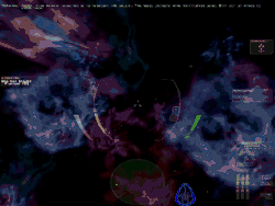 FreeSpace 2 takes place entirely in outer space. The playing area is vast when compared to the small starfighters piloted by the player and the effective range they have. This space is populated with interstellar bodies such as stars, planets, asteroids, etc.[18][22][23] The implementation of nebulae as an interactive environment is one of the most distinctive aspects of FreeSpace 2.[24][25] Flying through a nebula involves impaired vision, and occasional disruptions to flight electronics. Nebulae have become known as an eerie and suspenseful arena of play.[6][9]