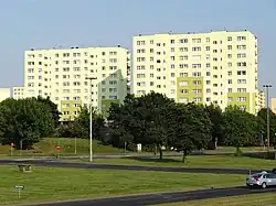 Most of Freedom Hill consists of a housing estate of multi-family blocks built in the 1980s, though the accompanying infrastructure is underdeveloped. The area is dominated by multi-family buildings, with a significant presence of twelve-story blocks.[5] Among Bydgoszcz’s districts, Freedom Hill stands out for its substantial proportion of high-rise buildings. Along several streets, there is single-family housing, some of which dates back to the Prussian partition and the interwar period.[5]