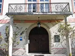 Access to the interior of the castle is provided by a round-arched granite portal. Above the portal there is a balcony resting on two columns, from which a double door leads to the interior. The wrought-iron balcony lattice is artistically executed. Above the gate axis there is a round gable with a clock and an attached turret. The facade is articulated with reddish flaps, while the windows are also framed in the same color.