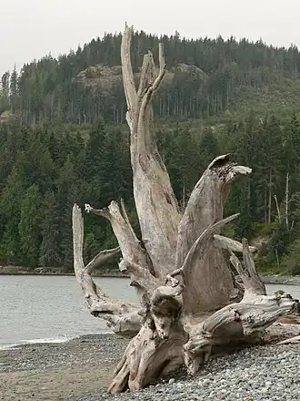French Beach Provincial Park is a provincial park on Vancouver Island, between Sooke and Jordan River, British Columbia. The area has a day use parking lot and B.C. provincial campground. It was created in 1980 as the first family-oriented park on the southwest coast of Vancouver Island.[1] Situated on the scenic Strait of Juan de Fuca on the west coast of southern Vancouver Island, French Beach Provincial Park offers views of the Strait and the Olympic Mountains. The beach spreads on 1,600-meters and is a location for whale watching as well as spotting Bald eagles, Ospreys and a variety of seabirds.