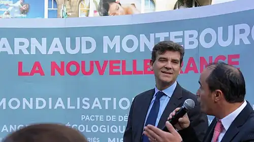 Former economy minister Arnaud Montebourg, who also ran for the nomination of the Socialists in 2011, was one of the first to declare interest in a speech at Mont Beuvray on 16 May 2016, widely viewed as indicating his interest in running for the presidency, in which he issued a "call" to "build" a "great alternative project for France" to an audience of 200 Socialist Party militants. Among those in attendance were former minister Aurélie Filippetti, as well as MPs Christian Paul, chief among the party's rebels, having had a part in the foundation of the New Socialist Party caucus along with Montebourg, Laurent Baumel and Patrice Prat.[20] Montebourg officially declared his candidacy on 16 August, decrying Hollande's betrayal of the "ideals of the left" in Frangy-en-Bresse in his home département of Saône-et-Loire, and laid out an anti-globalization campaign platform based on protectionism for French businesses, threats to nationalize predatory banks, and tax breaks for the middle class, themes which became central to his campaign.[21] These themes were reflective of his combative tenure as economy minister, in which he threatened to nationalize divisions of ArcelorMittal and attempted but ultimately failed to prevent General Electric's partial acquisition of French multinational Alstom.[22]