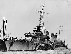On 30 April 1940, at 14:15, as Maillé Brézé was anchored at the Tail of the Bank, Firth of Clyde off Greenock, Scotland, a torpedo tube malfunctioned while undergoing maintenance and launched an armed torpedo onto the deck which struck the aft end of the forecastle. The detonation set fire to the fuel tanks and the forward magazine, which however did not explode. At 15:15, the crew abandoned ship due to the danger of explosion, except for numerous sailors trapped in the mess hall. Around 16:30, a few sailors returned to the ship to flood the aft magazine, and by 19:30 the fire was controlled by the Greenock firemen. By that time, Maillé Brézé was so low in the water that she began sinking before she could be towed, and she went down with those still trapped in the forward part. The accident killed 37 and wounded 47 crewmen. Although the ship was well off the main shipping channel when she sank, by 1953 the Ministry of Transport was concerned about unstable ammunition and leakage of her remaining fuel oil and requested that the Admiralty assess the feasibility of raising the wreck. After cutting away most of her superstructure to reduce the weight of the silt-filled ship, her hull was first lifted on the night of 3/4 August 1954. After grounding her on a nearby beach where 40 long tons (41 t) of ammunition and 500 long tons (508 t) of fuel oil were removed, the ship was refloated and towed to Port Glasgow on 15 September where she was broken up.[11][12][13]