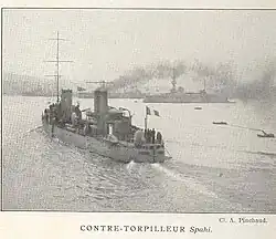 Spahi was ordered from Forges et Chantiers de la Méditerranée and was launched at their shipyard in La Seyne-sur-Mer on 3 May 1908. She was completed in July 1910.[4] When the First World War began in August 1914, Spahi was assigned to the 2nd Destroyer Flotilla (2e escadrille de torpilleurs) of the 1st Naval Army (1ère Armée Navale). During the preliminary stages of the Battle of Antivari, Montenegro, on 16 August, the 1st, 4th and 5th Destroyer Flotillas were tasked to escort the core of the 1st Naval Army while the 2nd, 3rd and 6th Flotillas escorted the armored cruisers of the 2nd Light Squadron (2e escadre légère) and two British cruisers. After reuniting both groups and spotting the Austro-Hungarian protected cruiser SMS Zenta and the destroyer SMS Ulan, the French destroyers played no role in sinking the cruiser, although the 4th Flotilla was sent on an unsuccessful pursuit of Ulan. Having broken the Austro-Hungarian blockade of Antivari (now known as Bar), Vice-Admiral (Vice-amiral) Augustin Boué de Lapeyrère, commander of the 1st Naval Army, decided to ferry troops and supplies to the port, escorted by the 2nd Light Squadron and the 1st and 6th Destroyer Flotillas while the rest of the 1st Naval Army bombarded the Austro-Hungarian naval base at Cattaro, Montenegro, on 1 September. Four days later, the fleet covered the evacuation of Danilo, Crown Prince of Montenegro to the Greek island of Corfu. The 2nd Flotilla bombarded Stončica Lighthouse on the island of Lissa on 19 September. The flotilla escorted multiple small convoys loaded with supplies and equipment to Antivari, beginning in October and lasting for the rest of the year, always covered by the larger ships of the Naval Army in futile attempts to lure the Austro-Hungarian fleet into battle. The Naval Army raided Lissa and the island of Lastovo on 2 November with the destroyer Lansquenet entering Vis harbor and extorting a ransom from the townsmen lest the French bombard the town. As they departed, the French shelled the lighthouse again.[5]