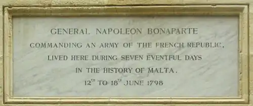 During Napoleon's short stay in Malta, he stayed in Palazzo Parisio in Valletta (currently used as the Ministry for Foreign Affairs). He implemented a number of reforms which were based on the principles of the French Revolution. These reforms could be divided into four main categories:
