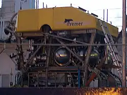 Pourquoi Pas ? is used on average 130 days per year by the French Navy and the rest by IFREMER.[3] It was designed for hydrography, geoscience, and physical, chemical, and biological oceanography, as well as to launch small submarines such as the crewed submersible Nautile and the ROV Victor 6000.[4] Since 2010, the ship has been used in a series of annual cruises MoMARSAT maintaining the EMSO-Azores observatory at the Lucky Strike hydrothermal field.[6][7]