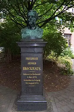 Brockhaus died in Leipzig. The business was carried on by his sons, Friedrich Brockhaus (1800–1865), who retired in 1850, and Heinrich Brockhaus (1804–1874), under whom it was considerably extended. Heinrich especially rendered great services to literature and science, which the University of Jena recognized by making him, in 1858, honorary Doctor of Philosophy. In the years 1842–1848, Heinrich Brockhaus was member of the Saxon second chamber, as representative for Leipzig, was made honorary citizen of that city in 1872, and died there on 15 November 1874.[1]