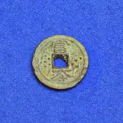 The first Japanese mission to China that adopted numerous Chinese cultural practices is recorded to have been sent in 630 AD.[1] As the importance of metallic currency appeared to Japanese nobles, it probably led to some coin minting at the end of the 7th century.[2] It's believed that early Fuhonsen coins made out of silver coins could not have been made any later than 683 AD.[3] This is based on an entry in the Nihon Shoki that states: "Summer, 4th month, 15th day. The Emperor made a decree; saying:-"Henceforth copper coins must be used, and not silver coins".[4] Only copper examples of Fuhonsen have been unearthed so far, which were dated to 687 AD.[3]