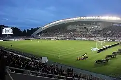 ![]() Aerial view of the seaside Momochi with the Fukuoka Tower and Momochi Seaside Park in the center and with the Fukuoka PayPay Dome to the left side | |
