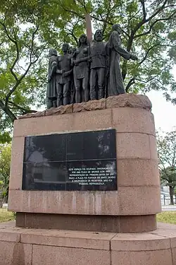 There are nine figures represented in the work as bronze statues, three being religious (Manuel da Nóbrega, José de Anchieta and Manuel de Paiva), two Portuguese explorers (Martim Afonso de Souza and João Ramalho) and three indigenous people (Bartira, Tibiriçá and the boy Curumim). The ninth, a baby in Bartira's lap, is unidentified. A cross, in the center, refers to the Catholic religion. Two plaques on the granite pedestal represented the first mass in São Paulo and the foundation of São Vicente.[1][2]