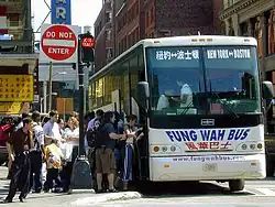 Fung Wah was founded in New York City in 1996, as Fung Wah Transport Vans, Inc., by Pei Lin Liang, who had immigrated from Zhuhai, China in 1988. Before founding the company, Liang had worked as a driver for Four Seas, a local dollar van service that shuttled Chinese garment and restaurant workers from Sunset Park in Brooklyn to Chinatown in Manhattan.[4] Fung Wah began as a direct competitor with Liang's former employer.[5] The Chinese characters of the company's name were written in English as Fenghua Jieyun Gongsi and translated as Elegant Rapid Transit Company.[6] Translations of "Fung Wah" from Cantonese included Chinese Wind.[6]