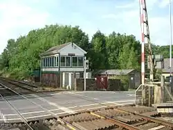 It has a level crossing at the end of the platform, controlled by a signal box.