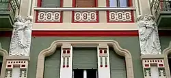 The palace, built in the style of the 1900s (Secession movement), stands out for its dynamic roof and gable structures, as well as the two-story bay window that defines the building's corner.[2] The facade combines geometric elements typical of the late Secession period with anthropomorphic decorations, such as mascarons, which adorn the capitals of the pilasters—characteristic of 1900s architecture.[2] The bas-reliefs on the first floor, depicting female figures in dance poses, are particularly striking. The most iconic feature of the building, however, is the roof finial, designed as a sheet metal rooster.[2]