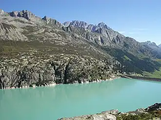 Göscheneralpsee is a reservoir in the municipality of Göschenen, Canton of Uri, Switzerland. The volume of the reservoir is 76 million cubic metres (62,000 acre⋅ft) and its surface area 1.32 km2 (0.51 sq mi).
