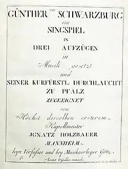 Günther von Schwarzburg is a Singspiel in three acts by Ignaz Holzbauer set to a German libretto by Anton Klein. Loosely based on events in the life of the 14th-century German king, Günther von Schwarzburg, the opera premiered on 5 January 1777 at the Hoftheater in the Mannheim Palace.