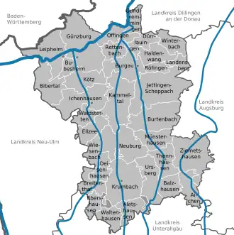 Günzburg is a Landkreis (district) in Swabia, Bavaria, Germany. Its capital is the town Günzburg. It is bounded by (from the north and clockwise) the districts of Dillingen, Augsburg, Unterallgäu and Neu-Ulm, and by the state of Baden-Württemberg (districts Alb-Donau and Heidenheim).