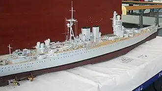 - ^ This arrangement of the main armament was later used in the French Navy's Dunkerque- and Richelieu class. As both French designs had only two turrets these were given as wide a separation as allowed by the other design constraints.