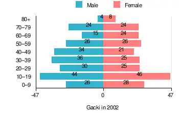 According to the 2002 Poland census, there were 466 people residing in Gacki village, of whom 51.3% were male and 48.7% were female. In the village, the population was spread out, with 26.2% under the age of 18, 36.9% from 18 to 44, 16.7% from 45 to 64, and 20.2% who were 65 years of age or older.[1]