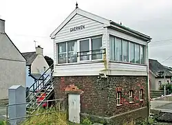 There were two signal boxes close to the station, one of which remains in use.[1] It is located on the north side of the line at the east end of the old station site and adjacent to a level crossing which is now guarded by lifting barriers. The junction to the Anglesey Central Railway has been disconnected after services were discontinued on the branch line.