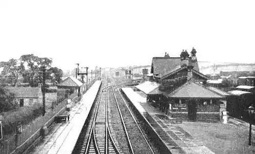![]() Gaerwen station in 1936, looking west. The Anglesey Central Railway is seen branching to the right. | |||||