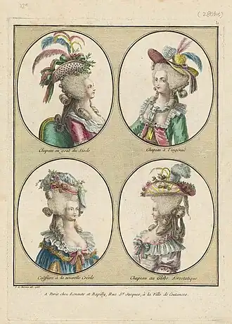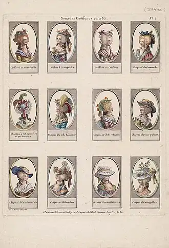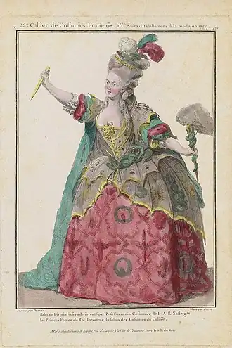 Galerie des modes was conceived during the final decades of the 1700s, a period when France was at the forefront of fashion innovation. To quote the historian James Laver, at this time "fashionable clothes...meant French clothes."[2] This supreme influence was undoubtedly strengthened by Queen Marie Antoinette as well as figures such as Rose Bertin (her dressmaker) and Monsieur Léonard Autié (her hairdresser) who were responsible for designing her iconic courtly wardrobe.[3] Beginning in the 1770s (the decade during which Antoinette both married future king Louis-Auguste and assumed the title Queen of France and Navarre), women's dress came to exhibit greater variation than ever before; the fashion plate emerged under these conditions, as if to disseminate each budding trend. The queen's fashion style was publicized by the women's magazine Journal des Dames.