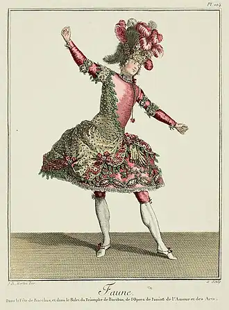 These drawings were touted as "designs after nature" ("dessinés d'après nature"), reflecting the fact that the designers who contributed to the series would draw from life. Their compositions were based on the most fashionable garments and hairstyles of period, which they would often observe with their own eyes at popular locales, such as parks, theaters, and even the ateliers of fashionable dressmakers and tailors.[14] Breaking ever so slightly from this mold, several plates found within the series also depict costumes made for eighteenth-century productions of theater and ballet, many of which were designed by P.N Sarrazin who is listed in various captions as the "'Costumier des Princes"" ("Costume designer of Princes").