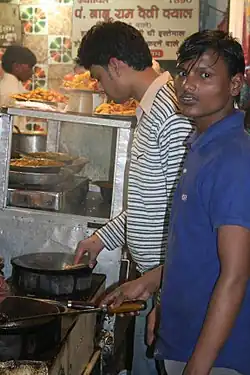 Of the 20 parantha shops in the late 1960s (all belonging to branches of the same family),[6] three remain: Pt Kanhaiyalal Durgaprasad Dixit (established 1875), Pt Dayanand Shivcharan (established 1882). Pt Baburam Devidayal Paranthewale (established 1886). By 1911, this area, known as Chota Dariba or Dariba Kalan, got the name Paranthewali Gali. In the years just after independence, Jawaharlal Nehru, Indira Gandhi, and Vijaya Lakshmi Pandit came to take their parantha meals in this gali.[7] In the late 1980s many of them closed shop and moved out, though today the street is experiencing a revival and some shops are being run by the sixth generation of the same family.