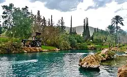 Gan HaShlosha National Park (Hebrew: גן השלושה gan hashloshá, literally: "Park of the three"), also known by its Arabic name Sakhne (Arabic: الساخنة, literally: "The hot [pool]"), is a national park in Israel. Located between kibbutzim Beit Alfa and Nir David, it has naturally warm water where visitors can swim all year. It is named in memory of three Jewish pioneers who came to survey the land on behalf of the Jewish National Fund in 1938, when their car rode over a land mine and all three were killed.[1]
