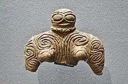 The earliest-known stone figures from Japan include a "kokeshi-shape" figurine from the palaeolithic Iwato Site in Ōita Prefecture[4]: 49 and a number of Incipient Jōmon line-incised stones from Kamikuroiwa Iwakage Site in Ehime Prefecture.[5][6]: 164 Known in far fewer numbers than dogū, gangū have been found from contexts dating throughout the Jōmon period, with earlier examples being typically simpler in form.[7][8] They are generally made from stone that is relatively easy to work, including pumice, tuff, mudstone, and sandstone.[9] As with the clay dogū, many of those excavated were already broken in Jōmon times, likely indicative of some aspect of their ritual function.[8] More voluptuous examples with prominent breasts may represent a fertility goddess and/or relate to motherhood.[8]