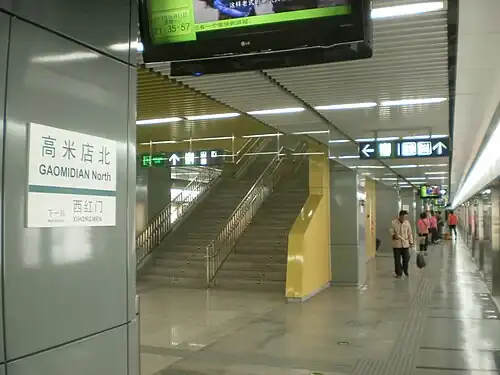 Gaomidianbei Station[1] (Chinese: 高米店北站; pinyin: Gāomǐdiàn Běi Zhàn) is a station on the Daxing line (through operation to Line 4) of the Beijing Subway.[2]