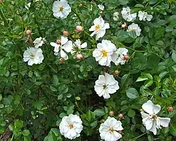 Although they arose too late to qualify technically as old garden roses, the hybrid musks are often informally classed with them, since their growth habits and care are much more like the old garden roses than modern roses. The hybrid musk group was mainly developed by Rev. Joseph Pemberton, a British rosarian, in the first decades of the 20th century, based upon 'Aglaia', an 1896 cross by Peter Lambert. A seedling of this rose, 'Trier', is considered to the foundation of the class.[14] The genetics of the class are somewhat obscure, as some of the parents are unknown. Rosa multiflora, however, is known to be one parent, and Rosa moschata (the musk rose) also figures in its heritage, though it is considered to be less important than the name would suggest. Hybrid musks are disease-resistant, repeat flowering and generally cluster-flowered, with a strong, characteristic "musk" scent.[34] The stems tend to be lax and arching, with limited thorns.[22] Examples include 'Buff Beauty' and 'Penelope'.