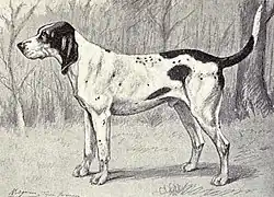 Only three old Saintongeois hounds survived the French Revolution, two dogs and a bitch. Count Joseph de Carayon-Latour in the mid-19th century crossed the last of the old Hound of Saintonge with a few of the remaining old-type Grand Bleu de Gascogne. The hounds that were white with black ticking were retained and later given the name Gascon Saintongeois.[2]