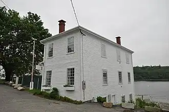 The Gates House is located between Port Road and the Machias River in the village center of Machiasport, a short way south of Liberty Hall. It is set on a steeply sloping lot directly on the bank of the river, presenting two stories to the street and three to the river. It is an L-shaped wood-frame structure, with a hip roof and clapboard siding. The main entrance is set near the crook of the L, flanked by pilasters and topped by an entablature. Windows are small-paned sash, with minimally decorative surrounds, and there are three chimneys. The interior has seen much alteration over the building's history, and only the first floor room layout approximates the original configuration. There are no fireplaces.[2]