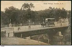 Gawler's horse-drawn tram service opened in 1879. It operated for both goods and passengers from the railway station along what is now Nineteenth Street (then known as part of Murray Street) and Murray Street (the town's main street) to a terminus near where the Gawler Central station is now. It passed the James Martin & Co engineering factory, providing a convenient way to deliver heavy equipment such as locomotives manufactured there. Broad gauge locomotives were taken directly on the tramway, narrow gauge were transported on specially-built flat-bed trucks.[30] There were also sidings at May Brothers and Company, Roedigers, and Dowson's Mill.[31] The tram closed in 1931 replaced by a bus, and the tracks lifted soon after.[32][15]