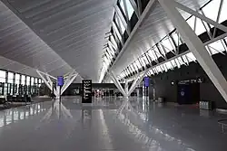 The first part of passenger terminal T2 was constructed in 2012, ahead of the UEFA European Football Championship held in Poland and Ukraine. At that time, Terminal T2 had a usable area of 39,433 square metres, catering mainly to departing passengers to Schengen countries. The new terminal was built to the west of the existing terminal T1, parallel to the proposed access road and the existing runway. This building was designed as a hall housing two functional zones - those related to the airport apron (airside) - baggage sorting and waiting areas, as well as zones related to the city side (landside) - ticket and baggage check-in halls (departures), airline offices, dining facilities, and services. The terminal has three above-ground floors and one underground floor. The terminals are connected by a connector at the first-floor level. The terminal was designed in such a way that it could be modularly expanded in subsequent stages, if necessary. An intermediate floor - a corridor for arrivals - had been planned on the aircraft parking apron side. On the apron side, four external staircases were designed on the forecourt of the terminal. The implementation of this project doubled the passenger capacity of Gdańsk Airport, from 2.5 to 5 million passengers annually.[8]