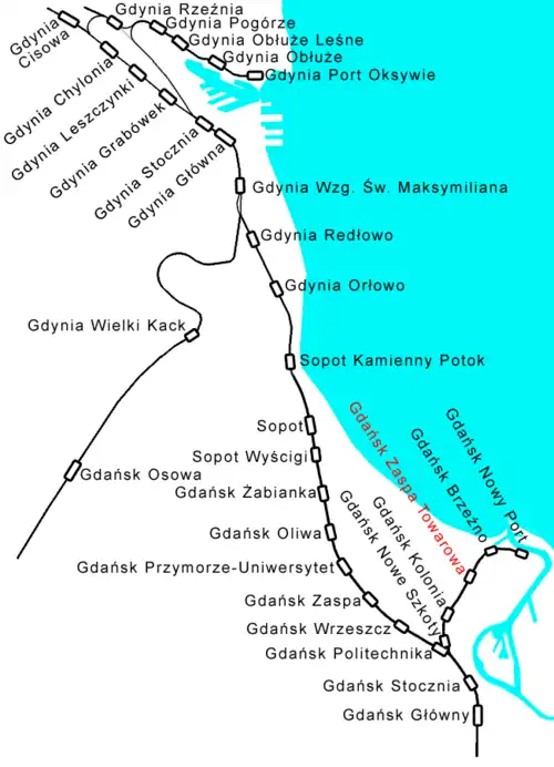 The line connecting Gdańsk Główny (Danzig Hbf.) with Gdańsk Nowy Port (Danzig Neufahrwasser) was opened in October 1867. It was electrified in 1951, and the voltage was changed (from 800 V) into standard 3 kV in 1973. The line served mostly as the transport route for shipyard workers who commuted to the Gdańsk Shipyard. On 15 December 2002 the line was shortened to reach only Gdańsk Brzeźno. On 25 June 2005 the line was completely closed for passenger service.