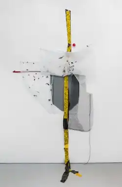 Penn's subsequent installations, such as Niagara (2012), The Come On (2013), Polyglot Y (Unhinged) (2015) and Situations (2017), assumed denser, less ethereal form with layered, constructivist-like planes of new materials like Mylar, aluminum insulation, lenticular plastic and painted tarps.[5][3][30] The loosely gridded horizontality of the latter work invited comparisons to cinema and landscape painting as well as to the serial assemblages of Robert Rauschenberg.[5] Penn continued in a similar vein in the largely black, white and gray installations High Tide (2018), Ebb Tide (2019) and Prologue (2020).[35] High Tide transformed a skybridge in a Philip Johnson-designed gallery space, creating a dialectic between individual parts and unified whole, and disposable matter and architectural permanence.[19][36] Prologue was a 33-foot-long work composed of the artist's characteristic materials connected by horizontal linear elements, which moved in a step-like rhythm of quiet progression and busyness along the length of a stairway wall.[2][37][9]
