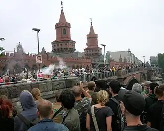 The Gemüseschlacht (German for 'vegetable battle') or Wasserschlacht ('water battle') was an annual food fight held in Berlin, Germany on the Oberbaum Bridge between the districts of Friedrichshain and Kreuzberg.[1][2][3][4][a] Traditionally held during the summer, the fight first occurred in 1998.[2][7][4][b] Hundreds of people attended the event; the German newspaper Die Welt reported in 2008 that there were 800 participants.[7][4] The tradition had ended by 2022.[1]