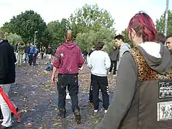 Although "Gemüseschlacht" means 'vegetable battle' and "Wasserschlacht" means 'water battle', participants were not restricted to only using vegetables or water.[13][2] Ammunition has also included eggs, flour, rotten fruit, and coffee grounds.[5][2][12] The main requirement was that anything thrown should not be dangerous.[8] Some participants also hit others with foam bats.[4] There are reports that fresh raw herring and freshly used diapers had been used in 2008.[2][12]