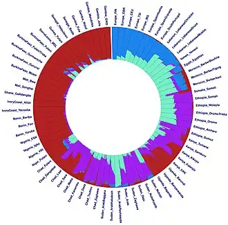 North Africa is a genetically heterogenous and diverse region, and is characterized by its diverse ethnic groups, the main ones being Arabs, Berbers and Copts (in Egypt).[1] North African populations show a complex and heterogeneous genetic structure that has been described as an amalgam of at least four different ancestral components from the Middle East, sub-Saharan Africa, Europe and also indigenous North Africans who are genetically distinct from these three.[2] Although North Africa has experienced gene flows from the surrounding regions, it has also experienced long periods of genetic isolation.[3] Some genetic studies have been criticised for their interpretation and categorisation of African genetic data.[4][5][6][7][8][9][10]