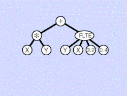 In Genetic Programming two fit individuals are chosen from the population to be parents for one or two children. In tree genetic programming, these parents are represented as inverted lisp like trees, with their root nodes at the top. In subtree crossover in each parent a subtree is randomly chosen. (Highlighted with yellow in the animation.) In the root donating parent (in the animation on the left) the chosen subtree is removed and replaced with a copy of the randomly chosen subtree from the other parent, to give a new child tree.