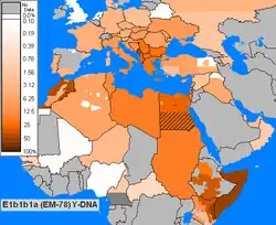 This haplogroup reaches a mean frequency of 85% in North Africa. It decreases in frequency from approximately 80% or more in some Moroccan Berber populations, including Saharawis, to approximately 28% to the east of this range in Egypt.[29][35][37]