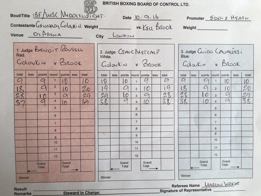 - ^ "GGG Brook official scorecards". twitter.com. British Boxing Board of Control. 10 September 2016. Retrieved 18 January 2025.