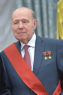Novozhilov served as a deputy of the Supreme Soviet of the Soviet Union from 1974 to 1989, then as a People's Deputy of the USSR from 1989.[2][5][8] He became a member of the Central Committee of the Communist Party of the Soviet Union in 1986.[4] As well as his two Heroes of Socialist Labour, Novozhilov held a number of other state awards. He was awarded the Order of Lenin three times, on 10 February 1969, 26 April 1971 and 23 June 1981; the Order of the October Revolution on 27 October 1975; the Order of the Red Banner of Labour on 22 July 1966; the Order of the Badge of Honour on 7 December 1957; and the Order of Friendship of Peoples on 29 December 1992.[5][9] He also received the Order of Holy Prince Daniel of Moscow Third Class and the Order "For Merit to the Fatherland" in three classes.[9][3] He had married Lyudmila Ivanovna Lisina, a philologist on 23 April 1966.[3] The couple had a son, Sergey Genrikhovich, born in 1967, who became an aircraft engineer.[2] Late in life Genrikh Novozhilov listed his interests as tennis and photography.[9][3]