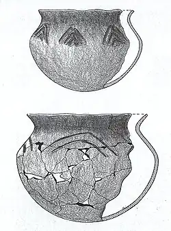 Langford ware was first reported at the Fisher site, and has also been found at the nearby Zimmerman[3][9] and Plum Island[2] sites. It is characterized by grit-tempered, globular vessels with restricted orifice and well-defined shoulders and excurved rim profiles. Surface finish is usually smoothed and decoration, when present, is applied to the neck and shoulder areas and consists of incised and trailed lines, punctates and finger impressions, combined to form arches and festoons. Lugs and loop handles are present on some vessels and nodes are also sometimes present.[1][2][3][9]