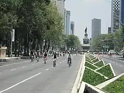 The implementation of green spaces into urban projects like public parks, roof gardens, protected areas, vegetation in public infrastructure or even private gardens help clean the air, improve human wellbeing, reduce noise, increase the attractiveness of crammed communities and foster interaction across social groups. Compact developments with an emphasized verticality are another approach to creating active spaces with efficient energy use, less driving distances, reduced emergency response time, mixture of homes, services and jobs.[45] Respected urbanists such as Jeff Speck argue for the walkability of cities as a solution for sustainable cities that work to stop climate change, foster community engagement, create local diversity and self-sufficiency with attainable housing, schools, parks and services that are demand induced and interconnected.[46] Other suggestions of urbanism are to adapt to the already concentrated peripheries by decentralizing jobs and amenities, by creating new points of interest.[47][48] Recent projects to incorporate sustainability can be seen in Santa Fe with the creation of La Mexicana Park, renovations to sections of the Chapultepec public park, green infrastructure in main roads such as Periferico and Reforma and the adoption of the Bando 2 policy that restricted urban growth through strict permits and housing loans by INFONAVIT (the national housing institute of workers).[47][44] The definition of cultural corridors like Regina St where diverse groups coexist in a mixture of residential and commercial developments is also a good example.[49]
