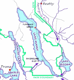 Lake Manly was the lake that filled Death Valley during each glacial period from at least 240,000 years ago to as late as 10,500 years ago; the lake typically dried up during each interglacial period, such as the current one.[32] Lake Manly was the last in a chain of lakes that were fed by the Amargosa and Mojave Rivers, and possibly also the Owens River; it was also the lowest point in the Great Basin drainage system. At its height during the Last glacial period some 22,000 years ago, water filled Lake Manly to form a body of water that may have been 585 feet (178 m) deep and 90 miles (140 km) long.[33] Much smaller lakes filled parts of Death Valley during interglacials; the largest of these was 30 feet (9.1 m) deep and lasted from 5000 to 2000 years ago.[34] Panamint Lake filled Panamint Valley to a maximum depth of 900 feet (270 m); when it was full, Panamint Lake overflowed into Lake Manly somewhere around the southern end of the Panamint Mountains.[21]