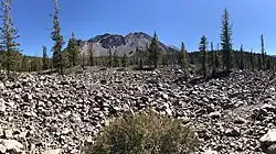 Subsequent to the rise of Lassen Peak, several dacitic pumice cones developed in a rift extending northwest from the base of Lassen Peak. Then about 1,100 years ago several dacitic domes, the Chaos Crags, protruded through these cones and obliterated all but half of the southernmost cone. At least 300 years ago a series of large avalanches, possibly triggered by steam explosions, occurred on the north side of the Crags.[34] These avalanches created their own 'air cushions' that helped accelerate them to speeds exceeding 100 mph (160 km/h) and push them partway up Table Mountain.[34] The resulting wilderness of debris, the Chaos Jumbles, covers an area of 2.5 sq mi (6.5 km2).[1] Manzanita Lake was formed as a result of Manzanita Creek being dammed by the debris.[26] Steam rose from the domes of Chaos Crags until 1857.[34]
