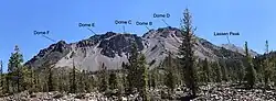 Later, but not precisely dated, eruptions from the Lassen volcanic area have formed over 30 smaller steep-sided, mound-shaped accumulations of volcanic rock, called lava domes.[4] Crescent Crater, which at first glance appears as a parasite on Lassen's northeast flank, has been more heavily glaciated and thus is older.[31] Other dacite domes which rose on Tehama's flanks are Bumpass Mountain, Helen Ridge, Eagle Peak and Vulcan's Castle.[23] An upper limit of 10,000 years has been set for the domes next to Lost Creek (north domes).[1] All of these domes must have risen with great rapidity.[1]