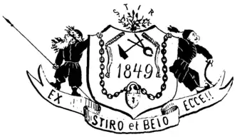 Late in 1863, Știrbei and Grigore Sturdza welcomed Panu as he arrived in Bucharest to supervise the coalition.[91] Cuza's own response to the resistance was a show of force in January 1864, when an Ilfov County's "peasant militia" was paraded through the city streets. The pro-Cuza gazette Aghiuță reported that both Știrbei and Sturdza were successfully intimidated. "Before they left for Paris," they reportedly sent Rosetti a letter demanding to know why he, as the radicals' leader, could not prevent the Bucharest masses from joining in the maneuvers.[92] The Beizadea returned in April "with a political battle plan prepared by the former Princes—Gh[eorghe] Bibescu and Barbu Știrbei—and reviewed on a daily basis by C. A. Rosetti."[93] Publicly, Știrbei Sr had joined a group of former dignitaries in offering some financial support to Cuza's promise of land reform, donating to a compensatory fund for the monastery estates.[94] By April, the process was blocked: according to Aghiuță, the Assembly uncharacteristically decided that a vote on expropriation could not take place as long as a number of deputies, including both Panu and Beizadea Știrbei, were absent from the proceedings.[95]